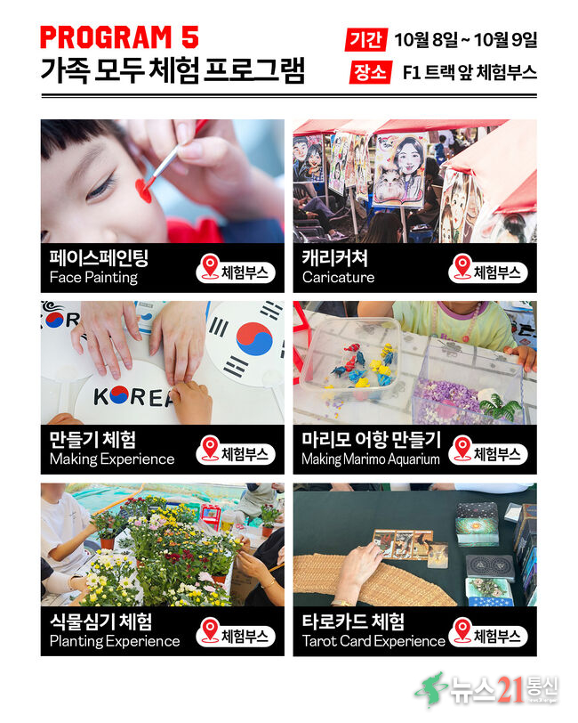 가족 단위 관람객을 위한 체험 프로그램도 풍성하다. 레이싱 시뮬레이터, 마리모 어항 만들기, 국화·다육식물 심기, 페이스 페인팅, 캐리커처, 타로카드, 창의력 만들기 체험 등 다양한 활동이 모두 무료로 운영된다.
