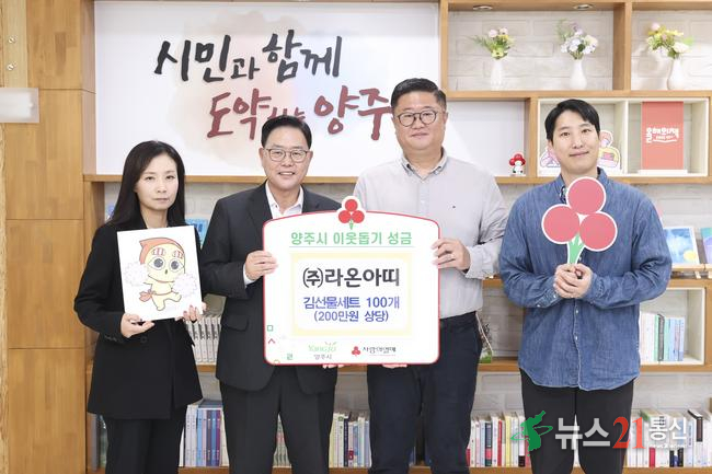 양주시가 지난 15일 옥정동에 위치한 사회적기업 ㈜라온아띠(대표 강세구)에서 김선물세트 100개(200만 원 상당)를 기탁받았다.