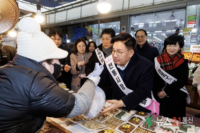 박강수 마포구청장이 아현시장에서 떡을 구매하고 있다. (사진=마포구 제공)