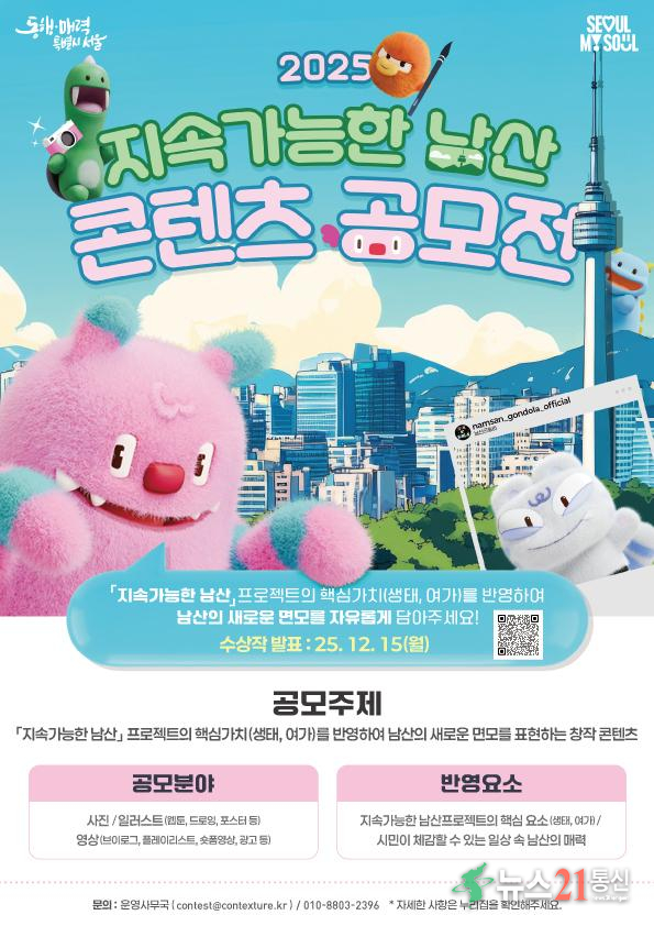 서울시는 시민과 함께 남산의 생태와 여가 가치를 새롭게 조명하기 위한 ‘2025 지속가능한 남산 콘텐츠 공모전’을 개최한다. 이번 공모전은 시민의 창의적인 시선을 통해 ‘지속가능한 남산’의 미래를 함께 그려보는 취지로 마련됐다.