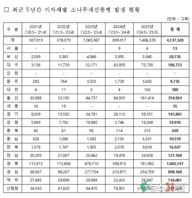 지역별로는 경북이 약 186만 그루로 피해가 가장 컸고, 경남(약 90만 그루), 울산(약 35만 그루) 등 영남권에 피해가 집중됐다. 특히 최근 5년간 재선충병 발생 건수는 4.8배 증가했으며, 대구 24배, 충남 16배, 광주 12배로 확산 속도가 가파르다.