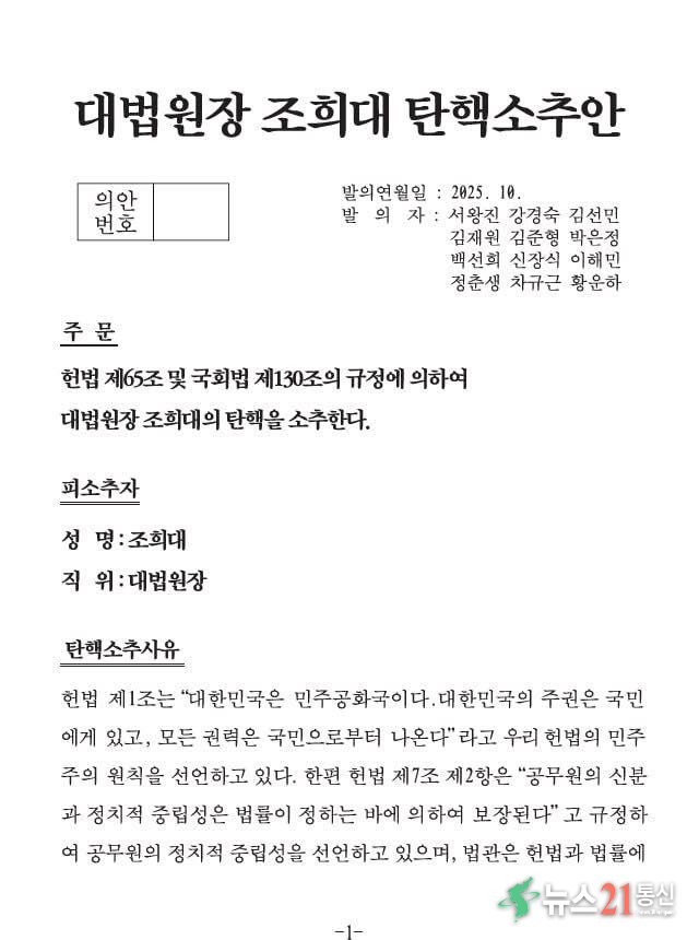 조국혁신당이 17일 조희대 대법원장에 대한 탄핵소추안을 공개하며 사법개혁을 위한 공세 수위를 높였다. 더불어민주당이 공식적인 탄핵 검토에 나서지 않은 가운데, 혁신당이 선명성을 앞세워 독자 노선을 강화했다.