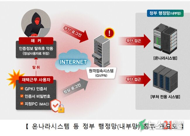 국정원에 따르면 해커는 다양한 경로로 공무원들의 행정업무용 인증서(GPKI), 패스워드 등을 확보해 인증체계 분석 후 합법적 사용자로 위장해 행정망에 접근했다. 해커들은 인증서 6개 및 국내외 IP 6개를 이용해 2022년 9월부터 올해 7월까지 행정안전부가 재택근무를 위해 사용하는 원격접속시스템을 통과, 온나라시스템에 접속해 자료를 열람했다. 대응 과정에서 일부 부처가 자체 운영 중인 전용 시스템에 접근한 사실도 추가로 확인됐다.
