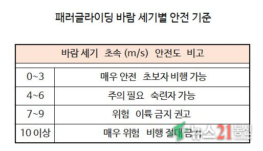 패러글라이딩 비행 바람 세기별 안전 기준표.◆“강풍 시 이륙 금지 기준은 초속 7m 이상”