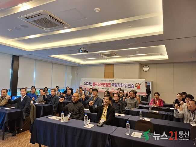사진=중구청제공[뉴스21 통신=김보미 ]울산 중구(구청장 김영길)가 10월 27일과 10월 28일 이틀 동안 경상남도 통영시 일원에서 ‘2025 중구상인연합회 역량 강화 공동연수(워크숍)’를 진행했다. 김영길 중구청장과 관계 공무원, 중구상인연합회 회원 등 35명은 인공지능(AI)을 활용한 전통시장 살리기 특강을 듣고 중앙전통시장 등을 찾아 ...