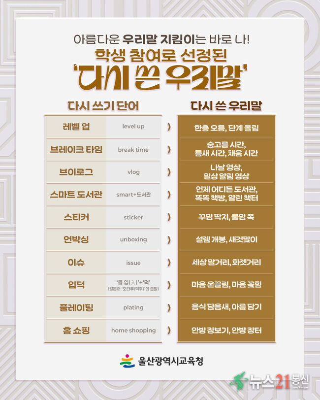 [뉴스21 통신=최세영 ] ▲ 사진제공=울산광역시교육청울산광역시교육청(교육감 천창수)이 지난 9월 29일부터 10월 23일까지 진행한 ‘하반기 학생 참여 우리말 다시 쓰기’에 울산지역 초중고 학생 3,558명이 참가했다. 이번 공모는 학생들이 일상에서 자주 쓰는 외래어나 신조어를 순우리말로 바꿔보며 우...