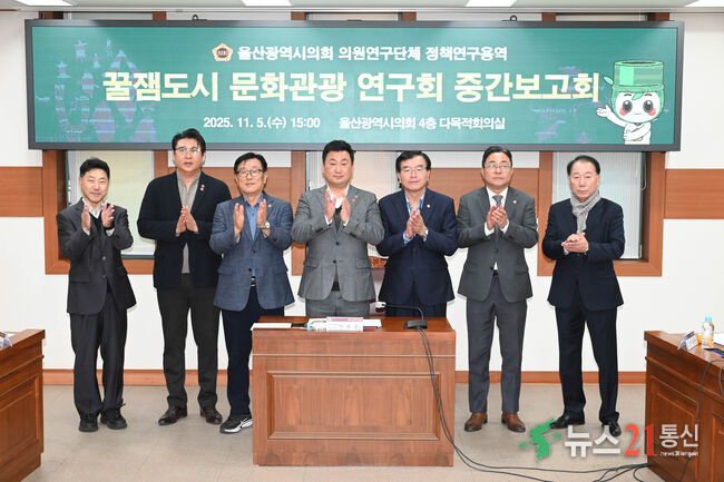 [뉴스21 통신=최세영 ] ▲ 사진제공=울산광역시시의회울산시의회 의원연구단체 ‘꿀잼도시 문화관광 연구회(회장 안대룡)’는 11월 5일 시의회 4층 다목적회의실에서 ‘꿀잼도시 이미지 정착을 위한 울산형 생태관광 활성화 방안 연구’ 정책연구용역 중간보고회를 개최했다. 이번 중간보고회는 지난 8월...