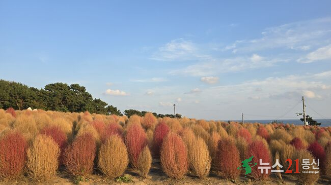 [뉴스21 통신=최세영 ] ▲ 사진=최세영 기자울산시 동구 대왕암공원과 슬도 사이에 위치한 ‘댑사리’ 일대가 가을을 맞아 붉은 코키아(댑싸리)와 황금빛 팜파스그라스로 물들며 시민과 관광객들에게 새로운 볼거리를 제공하고 있다고 5일 밝혔다.‘댑사리’는 울산 동구 대왕암공원과 슬도 등대를 잇는 해안길 중간 지점에 .