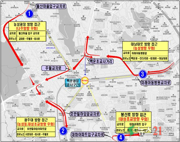 [뉴스21통신/장병기] 광주광역시 도시철도건설본부는 도시철도 2호선 1단계 4공구 공사로 인해 오는 11월25일부터 12월22일까지 남구 대남대로 주월교차로~백운교차로 280m 구간의 도로 통제를 확대한다. 이번 통제로 인해 기존 편도 3~4차로가 편도 2~3차로로 줄어든다.이 구간은 도시철도 건설공사와 대남대로 지하차도 공사가 동시에 진행 중이...