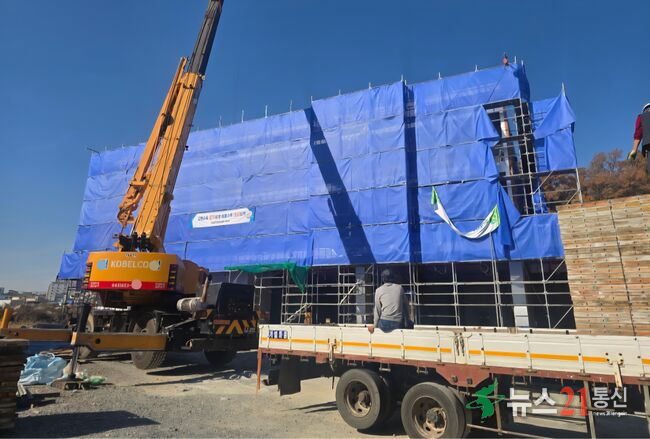 낙하물의 방호조치는 산업안전보건기준에 관한 규칙 제14조에 명시된 기본 중의 기본 안전조치다. 제천의 건축현장에는 낙하방지막 없이 공사가 진행중이다.
