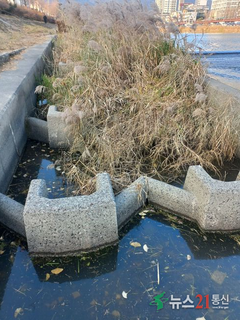 거창2교 상류 가동보 가장자리에 설치된 어도가 거창군의 무관심 속에 방치되면서 잡풀과 퇴적물 등으로 막혀, 수년째 본래의 기능을 수행하지 못하고 있어, 생태 통로로서의 역할이 사실상 마비된 상태다.