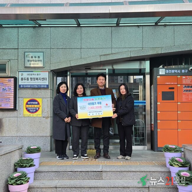 대전 중구 용두동(동장 윤양숙)은 2일, 대전시니어주간보호센터(대표 이범우)에서 저소득 한부모가정과 홀몸 어르신 등 취약계층을 돕기 위해 성금 200만 원을 기탁했다고 밝혔다.