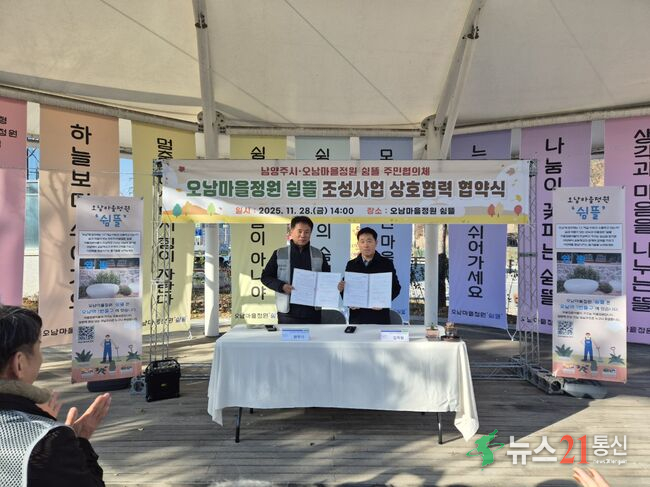 남양주시(시장 주광덕)는 지난달 28일 오남읍 양지리 723-4번지 일원에서 2025년 마을정원 조성 사업 대상지인 ‘오남마을정원 쉼뜰’ 주민협의체(대표 황학기)와 상호협력 협약식을 개최했다고 밝혔다.