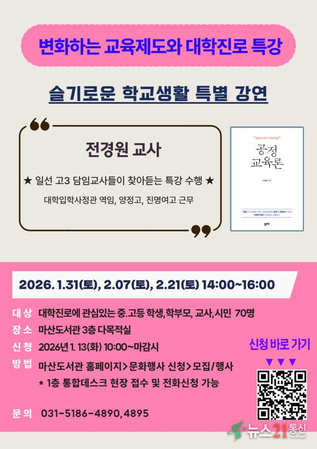 특별강연 운영 장소는 마산도서관 3층 다목적실에서 진행되며, 접수 방법은 ‘마산도서관 홈페이지 공지사항’ 또는 ‘전화 신청 및 도서관 현장신청’을 통해 2026년 1월 13일(화) 오전 10시부터 중학생 이상부터 성인까지 대상으로 선착순 70명을 모집한다.