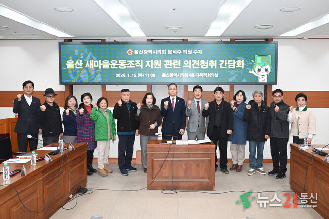 [뉴스21 통신=최세영 ] 울산광역시의회 문석주 의원(농소2동, 농소3동)은 15일 오전, 시의회 4층 다목적 회의실에서 울산 새마을운동 조직 지원 관련 의견청취 간담회를 개최했다. 이날 간담회에는 북구 새마을회(회장 정인락) 및 새마을협의회·부녀회 회장단, 시 자치행정과·인재교육과 관계 공무원 등 20명이 참석했다. 이번 간담...