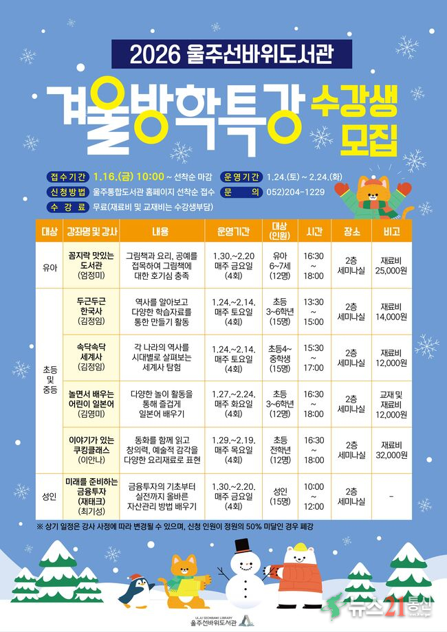 ▲사진제공:울주군청 울주선바위도서관이 겨울방학을 맞아 오는 24일부터 겨울방학특강을 운영한다고 15일 밝혔다.이번 프로그램은 유아를 대상으로 한 ‘꼼지락 맛있는 도서관’과 성인 대상 ‘미래를 준비하는 금융투자’, 초등 및 중학생을 위한 △두근두근 한국사 △속닥속닥 세계사 △놀면서 배우는 어린이 일본어 △이야...