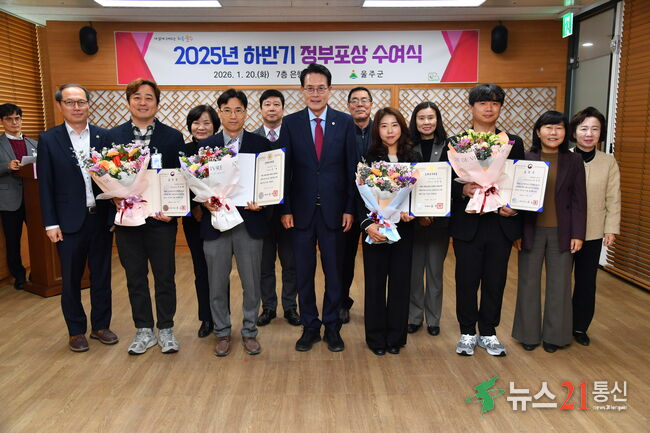 울산 울주군이 20일 군청 은행나무홀에서 2025년 하반기 정부포상 전수식을 개최한 가운데 이순걸 군수가 수상자들에게 표창장을 전달한 뒤 기념촬영을 하고 있다.