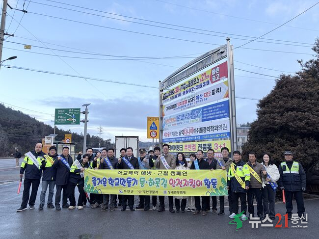 [뉴스21 통신=박철희 ] 무안군 청계자율방범대는 3일 청계중학교 앞에서 학교폭력 예방 캠페인을 펼치며 학생들의 안전한 학교생활 지원에 나섰다고 밝혔다.이번 캠페인에는 청계자율방범대와 생활안전협의회, 청계파출소 등 30여 명이 참여했다. 새 학기를 맞은 학생들을 대상으로 학교폭력 예방의 중요성을 알리고, 안전한 등·하굣길 ...