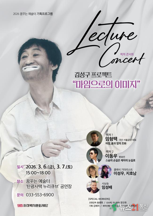 (재)태백시문화재단(이사장 이상호)은 “2026 꿈꾸는 예술터 기획프로그램 - 김성구 프로젝트 「마임으로의 이미지」” 렉처 콘서트를 개최한다고 밝혔다. 이번 프로그램은 마임을 중심으로 몸과 움직임, 음악, 이야기가 결합된 ‘렉처 콘서트’ 형식으로 구성됐다. 다소 낯설게 느껴질 수 있는 마임 예술을 쉽고 체계적으로 풀어...