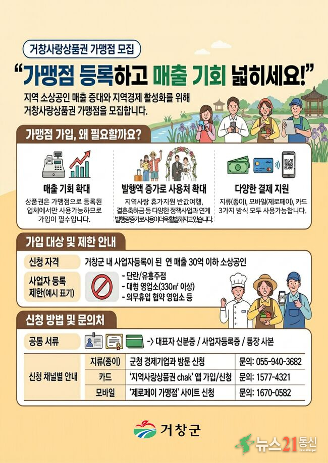 [뉴스21 통신=김희백 사회2부기자] 거창군은 지역 소상공인의 매출 증대와 지역경제 활성화를 위해 거창사랑상품권 가맹점을 확대 모집한다고 18일 밝혔다. 가맹 대상은 거창군에 사업자등록을 하고 영업 중인 연 매출 30억 원 이하 소상공인이며, 등록 시 신규 고객 유입과 매출 향상 효과를 기대할 수 있다. 거창사랑상품권은 거창군에서만 .