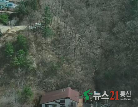 산자락 바로 아래 위치한 마을, 산과의 거리가 수십 미터에 불과한 ‘숲세권’ 지역에서 산불 위험이 커지고 있다. 마을 뒤편 산에는 거뭇하게 탄 흔적이 남아 있다.