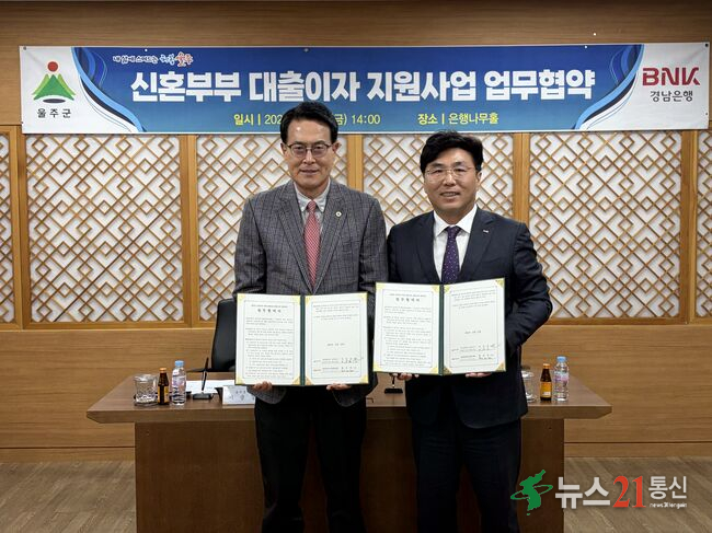 ▲사진제공:울주군청 울산 울주군이 신혼부부의 주거비 부담을 완화하고 안정적인 정착을 위해 추진 중인 ‘신혼부부 대출이자 지원사업’ 협약은행을 확대한다고 12일 밝혔다. 울주군과 BNK경남은행 울산영업그룹은 이날 군청 은행나무홀에서 이순걸 울주군수와 황재철 BNK경남은행 울산영업그룹장 등이 참석한 가운데 신혼부부 대..