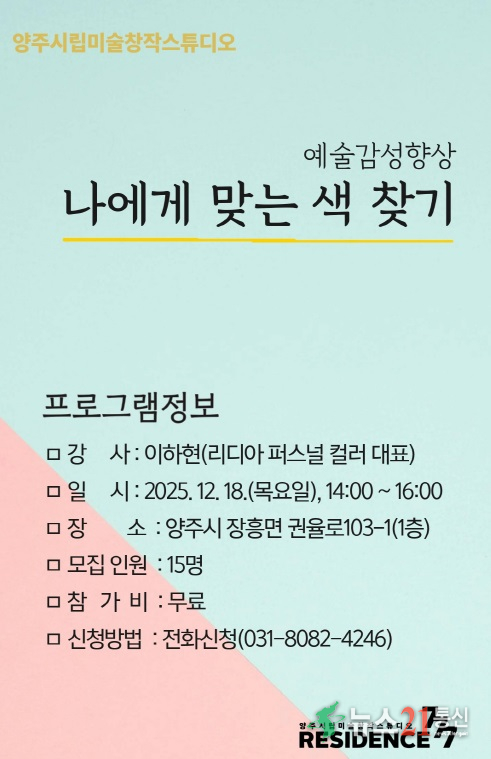 양주시립미술창작스튜디오는 오는 12월 18일 오후 2시 예술감수성 향상 프로그램 〈나에게 맞는 색 찾기〉를 운영한다.이번 프로그램은 색채의 구조와 원리를 이해하고 개인에게 어울리는 색을 발견하는 주민 참여형 교육이다.강의는 리디아퍼스널컬러 이하현 대표가 퍼스널컬러의 기본 개념과 활용법을 중심으로 진행한다.참가자들은 실..