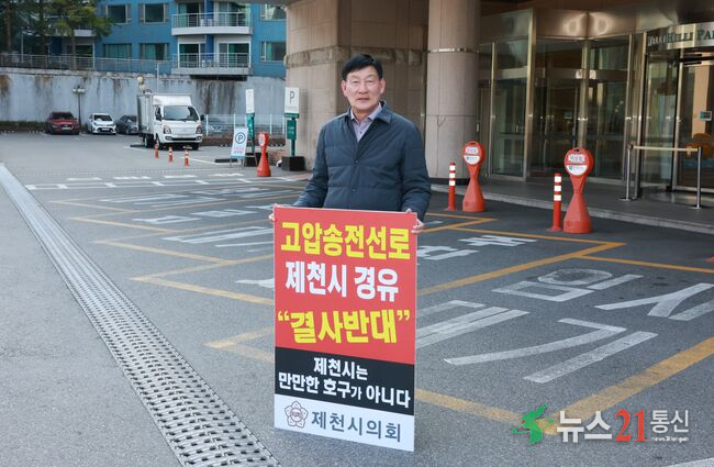 충북 제천시의회(의장 박영기)는 29일 산업통상자원부와 한국전력공사가 추진 중인 ‘신 평창~신 원주 송전선로 건설사업’ 입지선정위원회 회의장 앞에서 1인 반대 시위를 벌였다.이번 시위는 한전이 주민 의견을 수렴하는 절차를 형식적으로만 진행하고, 실질적으로는 일방적인 사업 추진에 나서고 있다는 점을 지적하기 위해 마련...