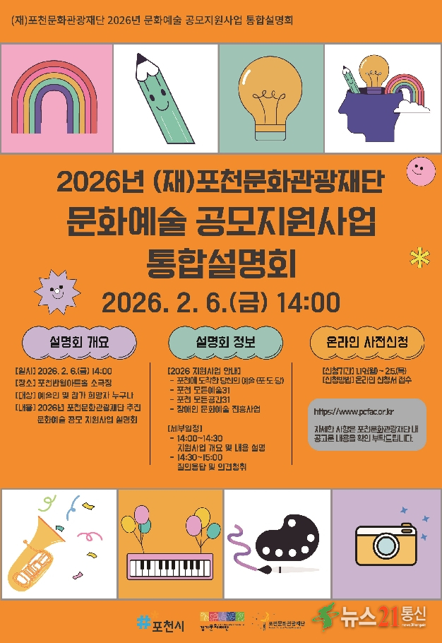 포천문화관광재단은 오는 2월 6일 포천반월아트홀 소극장에서 지역 예술인과 예술단체를 대상으로 ‘2026년 문화예술 공모지원사업 통합설명회’를 개최한다고 밝혔다.이번 설명회는 2026년 추진되는 문화예술 공모지원사업 전반을 소개하고 참여를 활성화하기 위해 마련되었으며, 지역 예술인들과 직접 소통하며 활동 과정의 어려움.