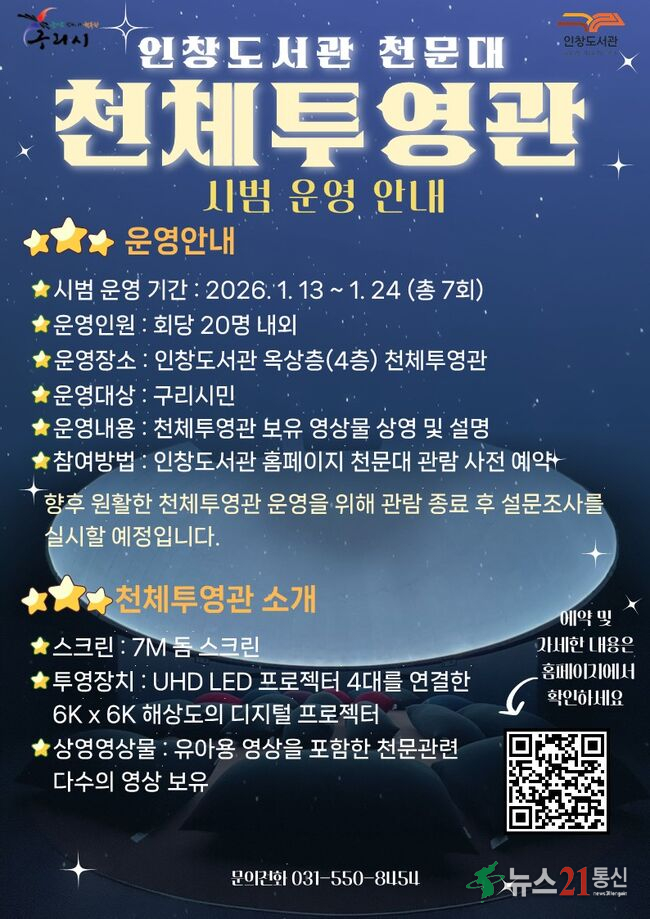 구리시는 1월 13일부터 24일까지 인창도서관 옥상 천문대 내 천체투영관의 시범운영을 실시한다고 밝혔다.이번 천체투영관은 기존 천문대가 눈이나 비 등 기상 여건으로 실체 관측이 어려운 한계를 보완하기 위해 조성됐으며, 지난해 8월 착공 후 5개월간 공사를 거쳐 12월 준공됐다.투영관은 지름 7m 경사식 반구형 돔 스크린과 최대 6K 해상도...