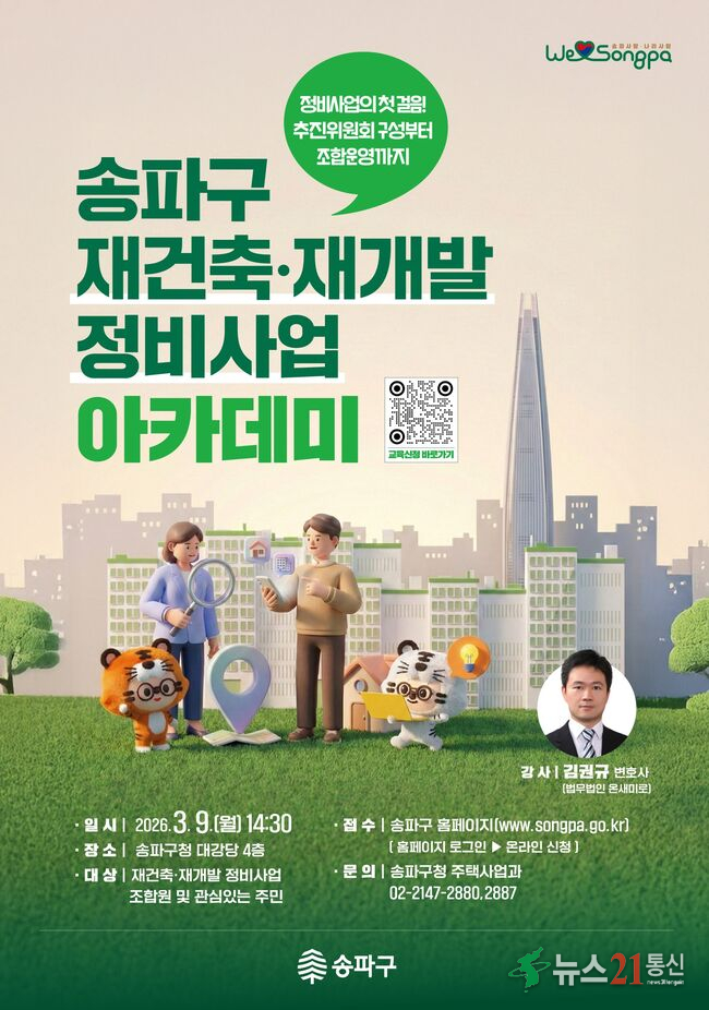 서울 송파구(구청장 서강석)가 재건축·재개발 정비사업의 초기 핵심 절차를 공개한다. ‘규제’가 아닌 ‘지원’ 중심 행정으로 전환한 이후 사업이 속도를 내는 가운데, 주민 이해도를 높여 신속 추진 기반을 다지겠다는 취지다. 송파구는 오는 9일 구청 대강당에서 「제1회 송파구 재건축·재개발 정비사업 아카데미..