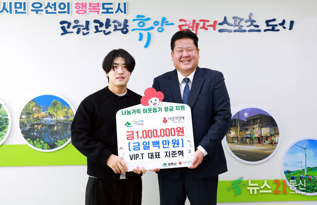 태백시는 15일 VIP.T 지준혁 대표가 ‘희망2026 나눔캠페인’ 성금 100만 원을 기부했다고 밝혔다.지 대표는 지역 사회의 관심과 사랑에 보답하고자 기부를 결정했으며, 앞으로도 지속적인 나눔 활동을 약속했다.이번 후원금은 강원공동모금회를 통해 소외계층 및 저소득 가구 지원에 사용될 예정이다.VIP.T는 지난 2023년에도 100만 원을 후.