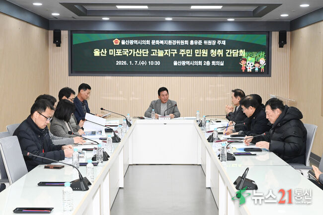 [뉴스21 통신=최세영 ]울산광역시의회 문화복지환경위원회 홍유준 위원장은 1월 7일(수) 오전 10시 30분, 시의회 2층 회의실에서 '울산 미포국가산단 고늘지구 주민 민원 청취를 위한 간담회'를 개최했다. 홍 위원장 주재로 열린 이번 간담회에는 고늘지구 발전협의회 및 지주 등 지역 주민과 울산시 국가산단과, 관광과, 해양수산과 ...