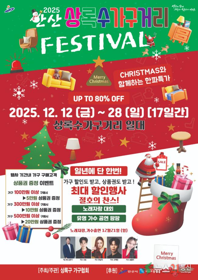 안산시(시장 이민근)는 지역 상권 활성화와 시민들의 연말 즐길 거리 제공을 위해 ‘제11회 안산 상록수 가구거리 축제’를 오는 12일부터 28일까지 17일간 상록수 가구거리 일대(용신로 435)에서 개최한다고 8일 밝혔다.올해로 11회째를 맞이한 이번 축제에는 상록수가구협회 소속 총 41개 점포가 참여해 소파, 침대, 인테리어 소품 등 다..