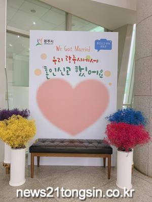 광주시는 혼인신고를 위해 시청을 방문하는 부부가 인생의 소중한 날을 오래 간직하고 행복한 추억을 남길 수 있도록 민원실에 혼인신고 기념 포토존을 설치했다고 2일 밝혔다.