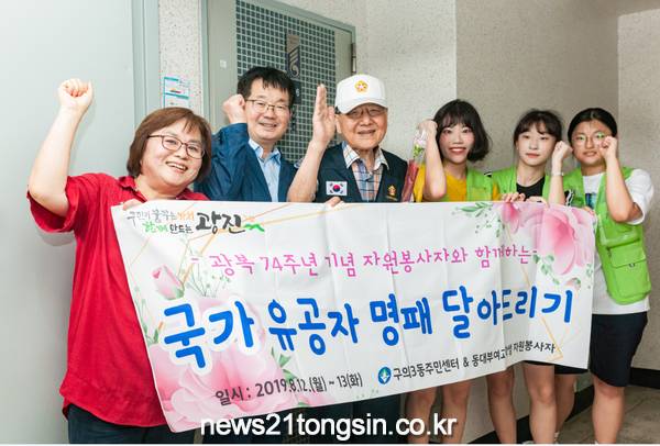 구는 12일부터 13일까지 이틀간 광복 74주년을 맞아 구의3동에 사는 국가 유공자 86명중 24가구에 찾아가 명패달아드리기를 실시했다.