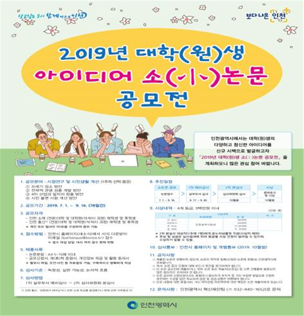 인천시(시장 박남춘)는 대학생 및 대학원생의 다양하고 참신한 아이디어를 신규 시책으로 발굴하여 이를 시정에 즉각 반영해 시민과 함께 살고 싶은 도시 인천을 실현하고자 「2019년 대학(원)생 아이디어 소(小)논문 공모전」을 9월 16일까지 개최한다고 밝혔다.
