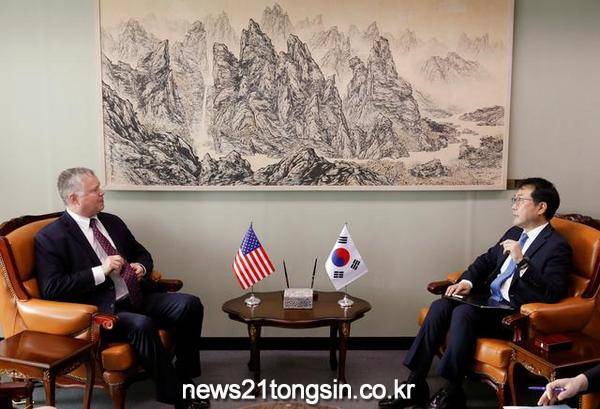 한미 대표는 오늘 서울 도렴동 외교부청사에서 이도훈 외교부 한반도평화교섭본부장과 한미 북핵수석대표 협의를 가졌다.