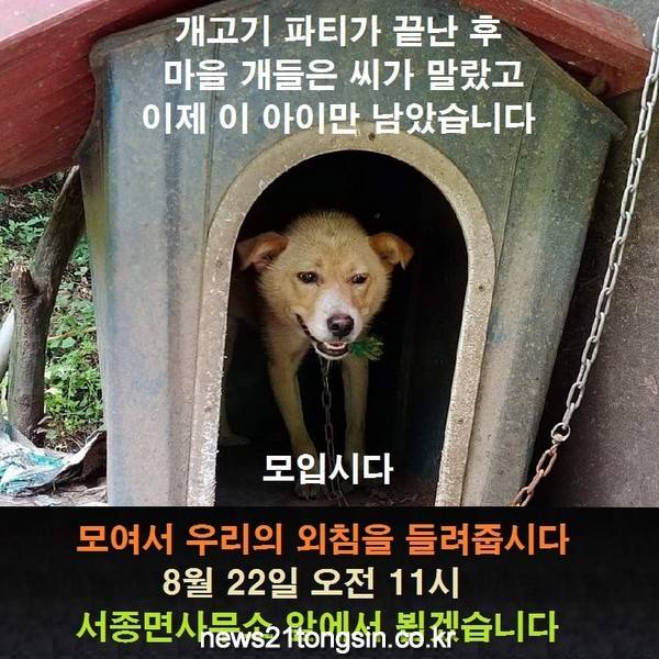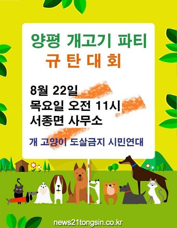 경기도 양평군 서종면에서 벌어진 집단 개고기 파티를 규탄하기 위해 전국 50개 단체가 연대하여 ‘개 고양이 도살금지 시민연대 (이하시민연대)’를 결성, 오는 22일 11시 서종면사무소 앞에서 집회를 가질 예정이다.