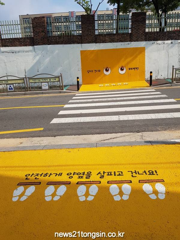 인도와 벽을 노란색으로 칠해 보행자 대기공간을 마련하고 “살피고 건너요! 안전하게 양팔을 벌리고 건너요! ” 등의 문구와 발모양, 눈모양 등의 이미지를 넣어 시각적 효과를 주었고, 차도에서 떨어져 보행 신호를 기다리게끔 유도하여 차량에서 배출되는 미세먼지를 감소 시킬 수 있도록 디자인하였다.