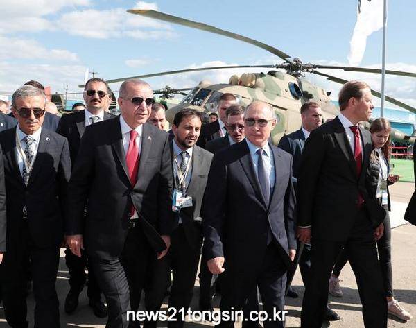 에르도안 대통령은 27일(현지시간) 러시아 모스크바주 주코프스키에서 열린 MASK-2019 에어쇼에 참가해 러시아 전투기인 수코이 SU-57의 시범비행을 관람했다.