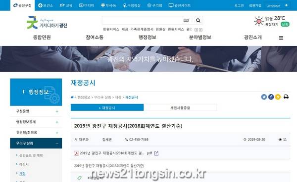 광진구가 지방재정의 책임성과 투명성 확보를 위해 2018회계연도 재정운영 결과를 지난달 20일 구 홈페이지에 공개했다.