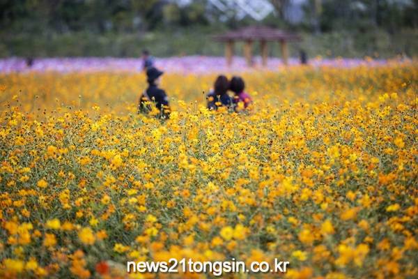 올해는 혼합코스모스와 황화코스모스 2종류 종자를 파종해 12만2,694㎡ 대단지에 펼쳐진 화려한 코스모스의 향연을 감상할 수 있다.