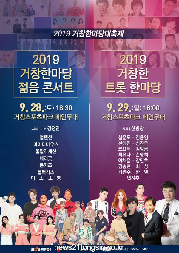 거창군은 2019 거창한마당대축제를 기념하고 군민들의 화합과 볼거리 제공을 위해 K-Pop과 인기 트롯 스타가수가 대거 출연하는 공연프로그램을 준비했다.