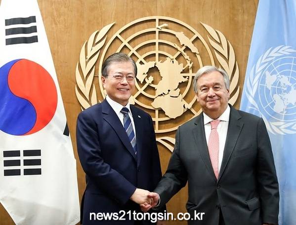 유엔총회 참석을 위해 미국 뉴욕을 방문 중인 문재인 한국 대통령은 현지시간으로 지난 23일 안토니우 구테흐스 유엔 사무총장과 만나 대북 인도적 지원과 관련해 향후 북한의 비핵화 진전에 따라 더욱 확대할 용의가 있다고 밝혔다.
