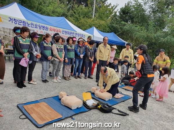 거창군립노인요양병원 시범훈련은 부군수 지휘하에 진행됐으며 건물 2층 화재 발생 상황을 가정한 시범훈련으로 거창소방서, 주부민방위대, 의용소방대, 보건소, 등 유관기관과 병원관계자 등 90여 명이 참여했다.