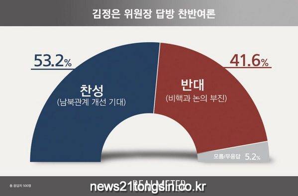 김정은 위원장, 11월 부산 한·아세안 특별정상회담을 통한 답방 가능성을 두고 실시한 이번 여론조사는 찬성 응답이 53.2%로, 반대 응답(41.6%)보다 오차범위(±4.4%p) 밖인 11.6%p 높은 것으로 집계됐다. ‘모름/무응답’은 5.2%.
