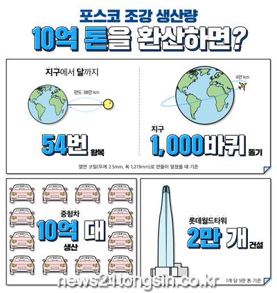 포스코는 73년 첫 쇳물을 생산한 이래 16년 만인 1989년 1월 누적 조강생산 1억톤을 달성한데 이어 32년만에 5억톤, 46년만에 10억톤 달성이라는 기록을 세웠다.