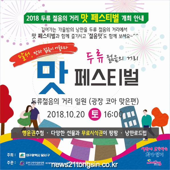 (대구 = 뉴스21통신/박창남기자) = 달서구는 오는 10월 12일 오후 6시부터 두류동 젊음의 거리 일원에서‘두류 젊음의 거리 2019 달서 맛 페스티벌’을 개최한다.