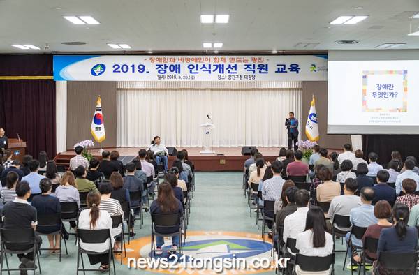 광진구(구청장 김선갑)가 17일 구청 대강당에서 직원들을 대상으로‘2019 장애 인식개선 교육’을 실시했다.